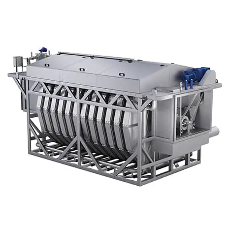 Κάθετοι δίσκοι τοποθετούνται σε έναν κοίλο άξονα και βυθίζονται στην ενεργό ιλύ. Καθώς οι δίσκοι περιστρέφονται και το υγρό ρέει μέσα από τα πλέγματα, η ενεργός ιλύς εναποτίθεται στο πλέγμα. Η υδραυλική πίεση στη συνέχεια συμπιέζει τη βιομάζα και σχηματίζει τη στρώση κέικ ιλύος. Η ροή του διηθήματος ελέγχεται από την ταχύτητα περιστροφής των δίσκων και ένα σύστημα συνεχούς αντίστροφης πλύσης του διηθήματος απομακρύνει τη στρώση κέικ ιλύος μετά από κάθε περιστροφή.