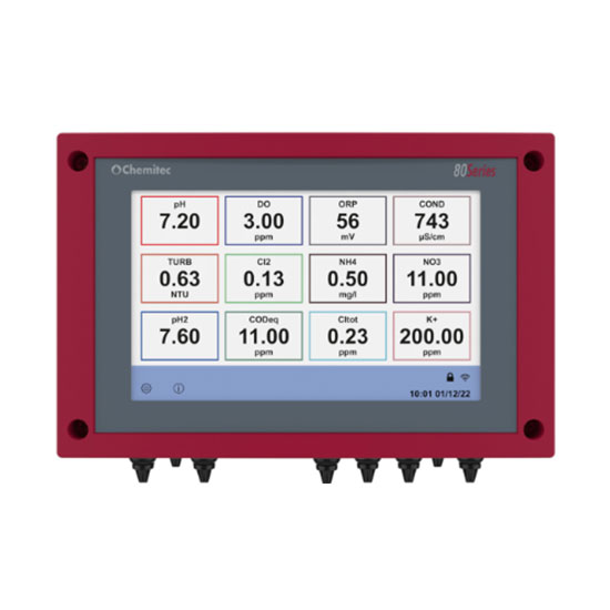 Ο controller 80 series, από τον ιταλικό οίκο Chemitec, είναι ένας αξιόπιστος ελεγκτής που έχει σχεδιαστεί για τη διαχείριση και παρακολούθηση διαφόρων παραμέτρων νερού και υγρών, όπως το διαλυμένο οξυγόνο, τα αιωρούμενα στερεά , η θερμοκρασία και άλλες σχετικές χημικές μετρήσεις. Η συσκευή μπορεί να υποστηρίξει έως και 12 αισθητήρες (probes) αναλογικού και ψηφιακού σήματος.