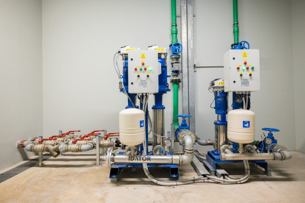 Για τις ανάγκες της ύδρευσης & άρδευσης, εγκαταστάθηκαν τρία (3) δίδυμα πιεστικά συγκροτήματα, όπου η κάθε αντλία έφερε το δικό της ενσωματωμένο Inverter Hydrovar. Το Inverter Hydrovar, γνωστό για την εξαιρετική του απόδοση, συνδεσιμότητα & αξιοπιστία, ήταν η βέλτιστη τεχνοοικονομική λύση, με το πλεονέκτημα του ότι το κάθε Inverter είναι στην ουσία ένα ολοκληρωμένο σύστημα με ενσωματωμένο PLC – PID controller, που σημαίνει ότι δεν υπήρχε η ανάγκη για χρήση εξωτερικού πίνακα με ενσωματωμένο PLC για τον έλεγχο των αντλιών και πολύ σημαντικότερο δε, προσέφερε 100% εφεδρεία καθώς το κάθε Inverter έφερε το δικό του ανεξάρτητο αναλογικό αισθητήριο πίεσης.