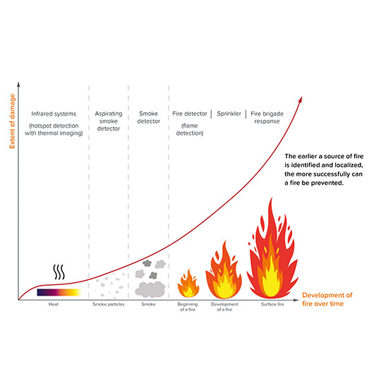 Μέσω των συστημάτων έγκαιρου εντοπισμού πυρκαγιάς και αυτόματης πυρόσβεσης, επικίνδυνα θερμά σημεία που μπορεί να μετατραπούν σε πηγή πυρκαγιάς, εντοπίζονται μέσα σε λίγα λεπτά, ακόμη και πριν εμφανιστεί καπνός ή φλόγες. Το έξυπνο λογισμικό και η ανάλυση των επιμέρους χαρακτηριστικών χρησιμοποιούνται για τον έλεγχο του περιβάλλοντος, διακρίνοντας μεταξύ καυτών κινητήρων, σωλήνων εξάτμισης και θερμών σημείων που μπορεί να υποδεικνύουν πραγματική ή πιθανή πυρκαγιά. Ενσωματωμένοι με το αυτόματο σύστημα πυρόσβεσης, οι εκτοξευτές νερού ελέγχονται ηλεκτρονικά και επιτυγχάνουν μέγιστη εμβέλεια με βέλτιστη ακρίβεια, χάρη στη βελτιστοποιημένη σχεδίαση για τη ροή “Oval Flat Design”. Ο απαιτούμενος ρυθμός ροής του κατασβεστικού υλικού μπορεί να ρυθμιστεί αυτόματα κατά τη λειτουργία.